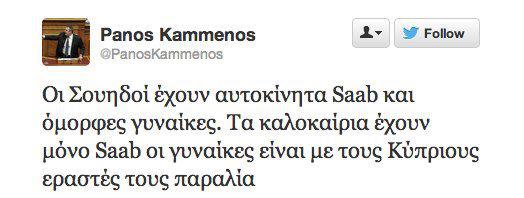 Ο πρόεδρος των Ανεξάρτητων Ελλήνων έγραψε στο twitter: «Οι Σουηδοί έχουν αυτοκίνητα Saab και όμορφες γυναίκες. Τα καλοκαίρια έχουν μόνο Saab, οι γυναίκες είναι με τους Κύπριους εραστές τους στην παραλία».