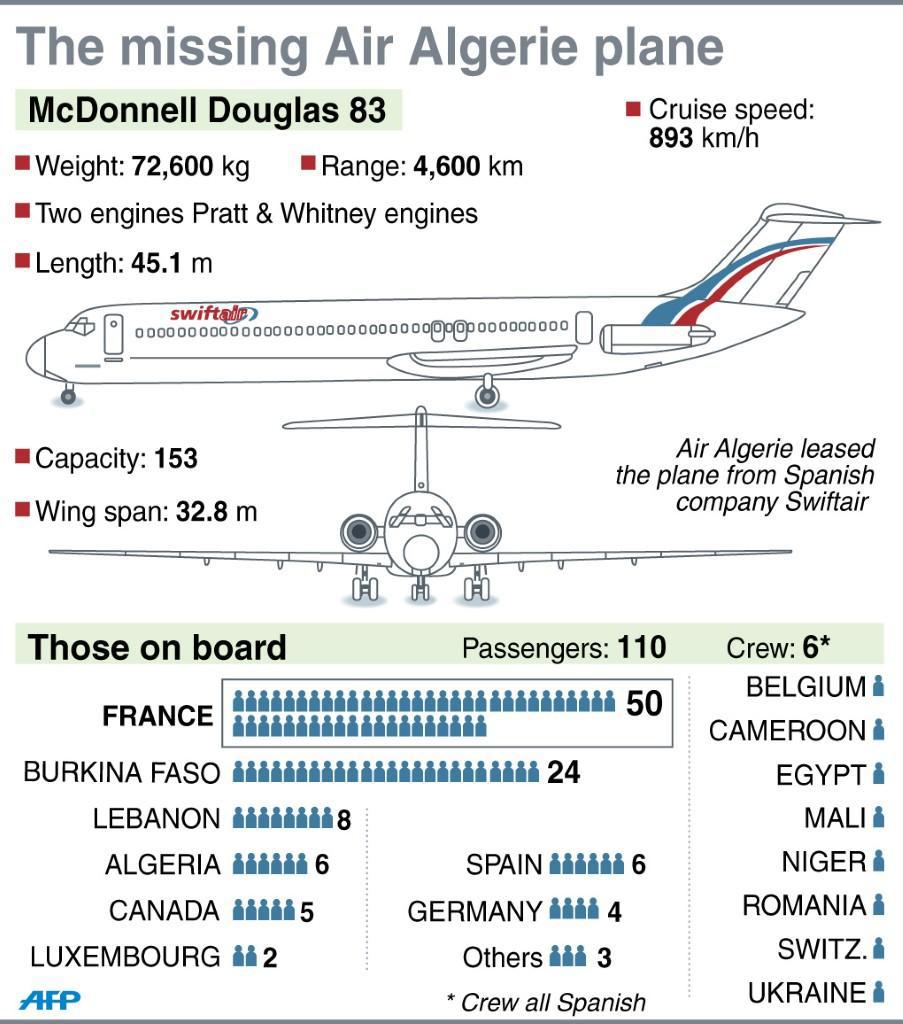 Το αεροπλάνο τύπου MD -83 της Air Algerie εκτελούσε το δρομολόγιο Ουγκαντούγκου -Αλγέρι και σε αυτό βρίσκονταν 110 επιβάτες και έξι άτομα προσωπικό. Δεν έχει ανακοινωθεί ακόμη επισήμως εάν θεωρούνται νεκροί οι επιβαίνοντες, ωστόσο, αυτό θεωρείται το πιο πιθανό ενδεχόμενο.