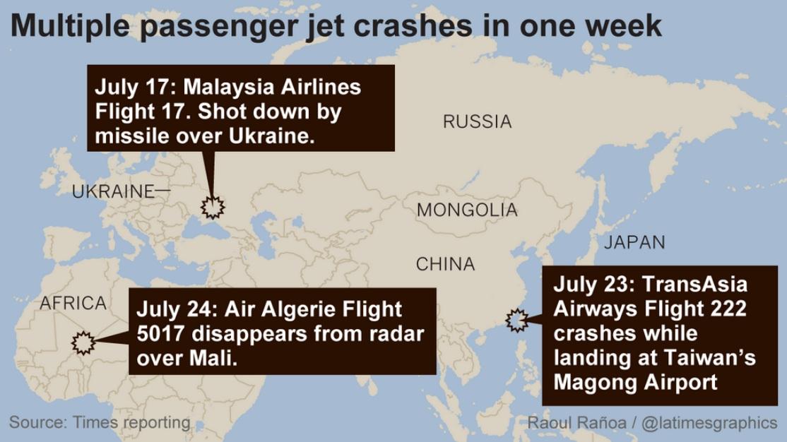 Σημειώνεται ότι η συντριβή του αεροσκάφους της Air Algerie, έρχεται λίγες ημέρες έπειτα από την κατάρριψη του Boeing 777 των μαλαισιανών αερογραμμών στην ανατολική Ουκρανία, που κόστισε τη ζωή σε 298 ανθρώπους και την χθεσινή τραγωδία με το αεροσκάφος της TransΑsia Αirways το οποίο συνετρίβη στη Ταϊβάν κατά τη διάρκεια αναγκαστικής προσγείωσης, με αποτέλεσμα να χάσουν τη ζωή τους, τουλάχιστον 48 άνθρωποι.